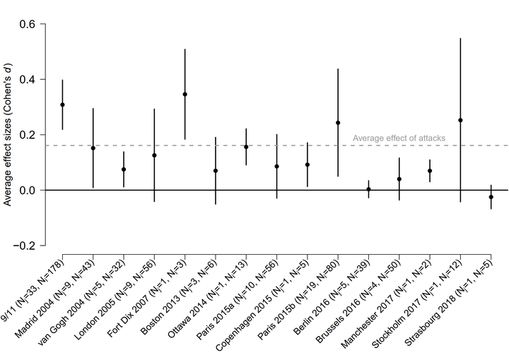 Average effects of different Islamist terrorist attacks reported in previous literature